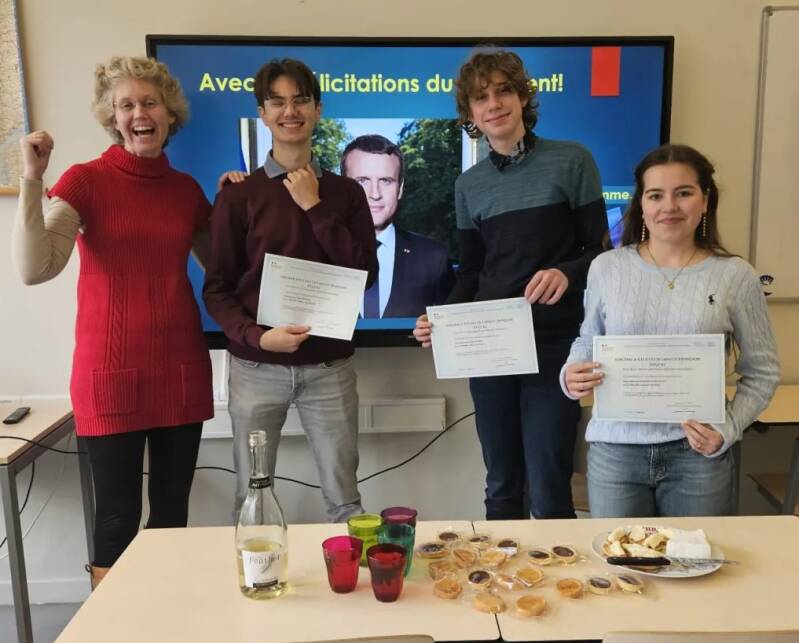 Onder genot van Franse nep-Champagne, lekkere fromage én tartelettes was het dinsdag 18 november eindelijk zo ver: deze 3 trotse leerlingen (Daniël Hospers, Marcel Schattenberg en Minque van de Meerendonk) hebben hun Delf-diploma voor B2 (vrij pittig!) in ontvangst mogen nemen! Er waren nóg 2 leerlingen geslaagd (Ruben Ouwehand en Rhea Rueban), maar zij konden helaas niet aanwezig zijn. Deze leerlingen hebben afgelopen juni hun examen voor de onderdelen lezen, luisteren, schrijven en spreken gedaan.